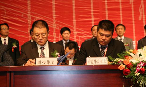 在10月18日举行的蚌埠投资环境说明会暨项目签约仪式上,蚌埠投资集团与五家外地投资者分别就五个项目达成合作协议并成功签约。与香港华富亚太投资有限公司签署高速铁路蚌埠站站前广场商业区经营项目合作框架协议,与中通国华大丰投资有限公司签署第四方物流项目合作框架协议,与中实化学技术有限公司签署液晶材料及医药中间体项目合作协议书,与上海荣杉贸易发展有限公司签署蚌埠中小企业信用担保有限公司增资扩股合作协议,下属热电公司与南京鹏熙建材有限公司签署工业物流园合作框架协议。五个项目中,高新技术项目2个,金融服务项目1个,商业服务项目1个,物流服务项目1个,总投资额18.5亿元,引入外地资金12亿元。