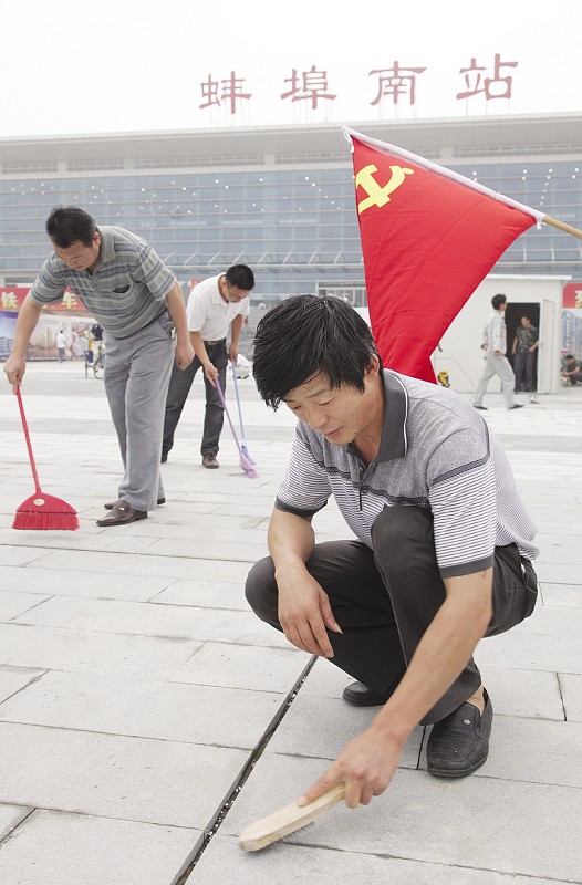 6月25日上午,为庆祝中国共产党建党90周年暨京沪高铁开通,蚌投集团党委组织集团本部及所属19个子公司共计198名党员去高铁蚌埠南站义务劳动,清理南站广场建筑垃圾并清扫地面,为高铁通车做出一个党员力所能及的贡献。