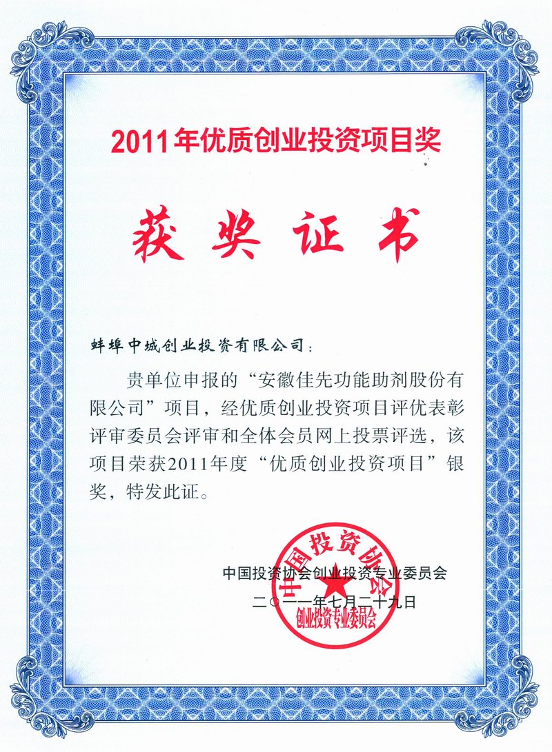 729,在首届中国创业投资行业峰会暨评优表彰颁奖仪式上,蚌埠中城创业投资有限公司(下称中城创投)申报的“安徽佳先功能助剂股份有限公司”项目,经优质创业投资项目评优表彰评审委员会评审和全体会员网上投票评选,荣获2011年度“优质创业投资项目”银奖。