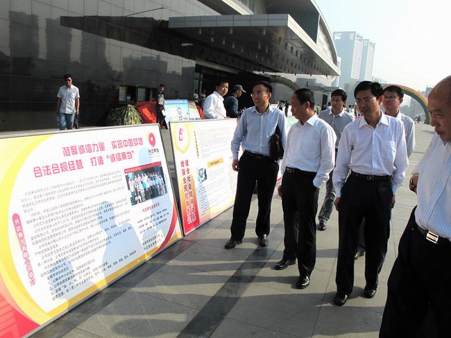 10月12日上午,在淮河文化广场上,兴达典当有限公司作为蚌埠市典当拍卖协会会长单位应邀参加了由市商务局牵头,联合市委宣传部、市文明办、市物价局、市经信委等17个部门共同举办的以“凝聚诚信力量,实现中国梦想”为主题的诚信兴商大型宣传活动,市人大、市政协及市商务局领导现场巡视了各单位宣传展板并与在场人员热烈交流。