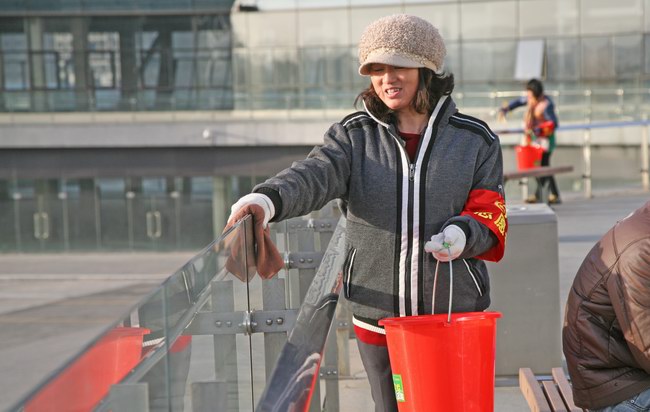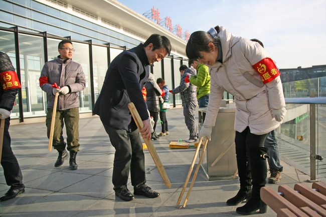志愿者分成两组。环境卫生组负责擦洗护栏、清扫路面等保洁服务。文明交通服务组负责为旅客指路、文明交通劝导服务。通过志愿者辛勤劳动,高铁南站广场环境卫生更加洁净,行人车辆通行有序,高铁南站作为我市的城市客厅更加亮丽。