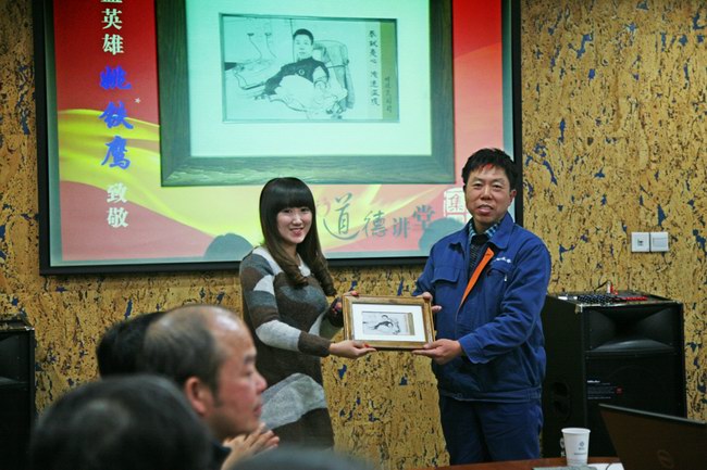 在学模范环节,我们的“身边人”—来自公司系统中环水务有限公司的蚌埠助人为乐好人姚铁鹰,讲述他十年义务献血2万5千毫升的感人事迹。在活动现场,公司向姚铁鹰赠送了由志愿者们制作的记录他献血义举时的肖像,并向全体职工倡议:向蚌埠好人姚铁鹰学习,将志愿服务化作自觉行为和生活方式。