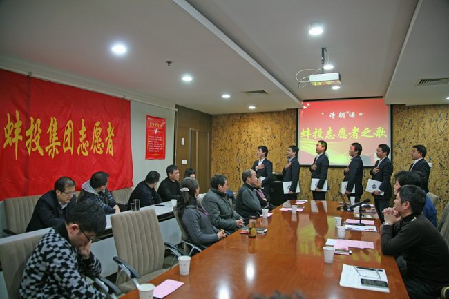 在谈感悟环节,主持人介绍了近期公司志愿者注册登记工作开展情况,宣布成立蚌投集团志愿服务队。在本环节中, 6名志愿者现场为大家带来了诗歌朗诵——《蚌投志愿者之歌》并庄严宣誓。